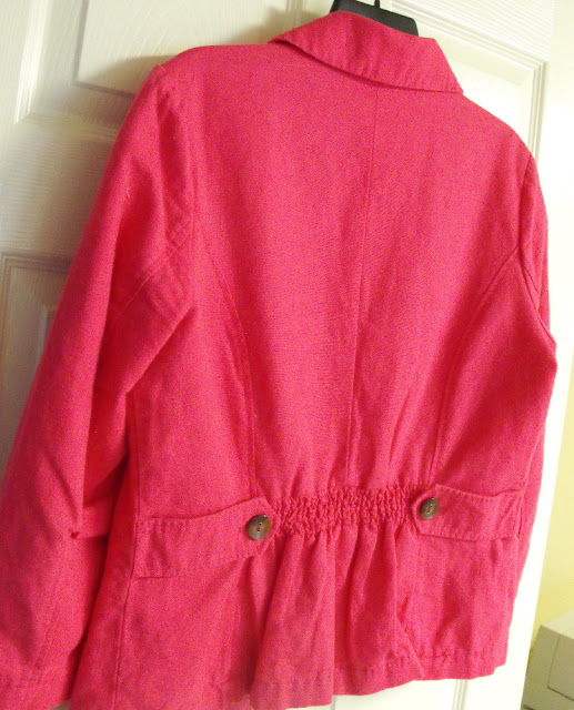 Three-quarter length sleeves are the perfect choice for this time of year. This fuchsia linen-like fabric is also great for the cool evenings of early spring. The jacket style is rather casual with pleated details and shell buttons, making it a good choice to pair with jeans and the tan pants I am wearing here.